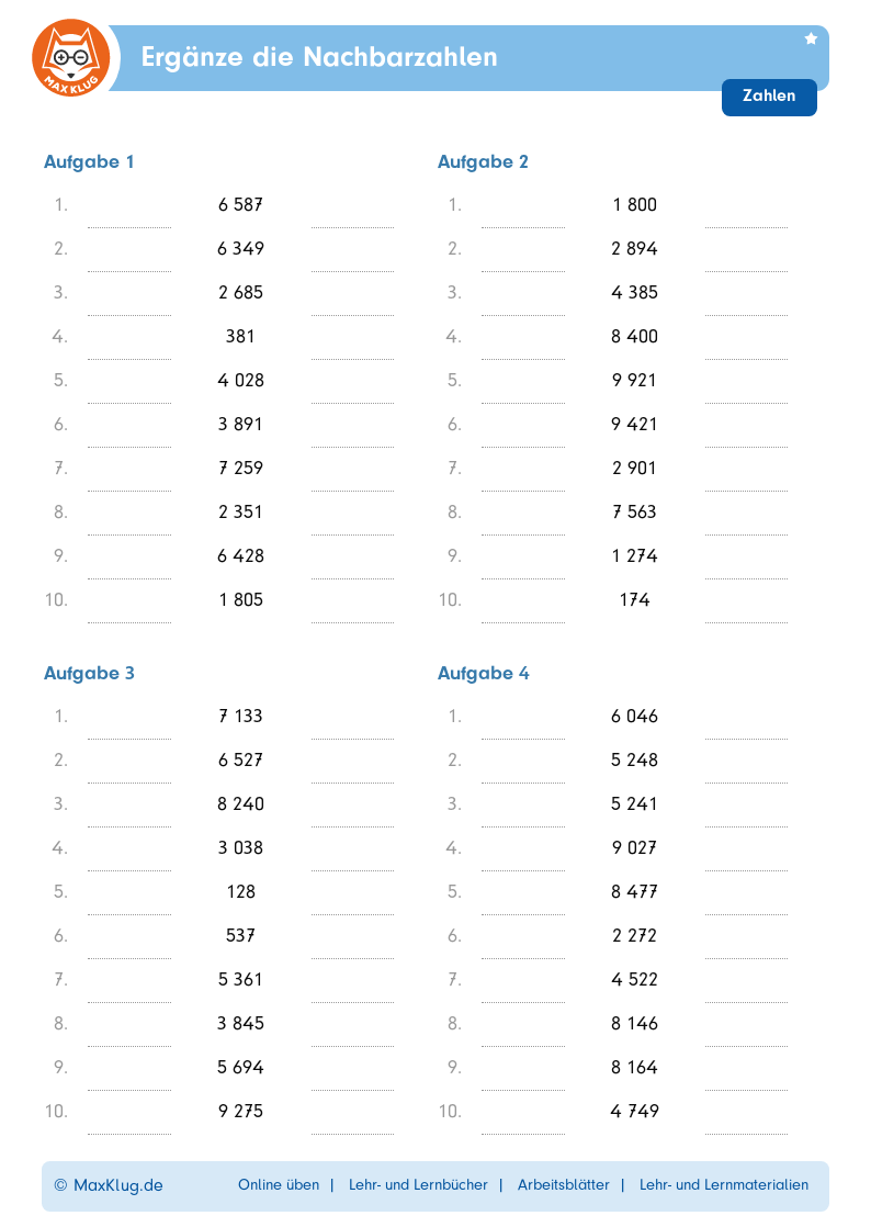 Arbeitsblatt 3: Ergänze die Nachbarzahlen (10 000)