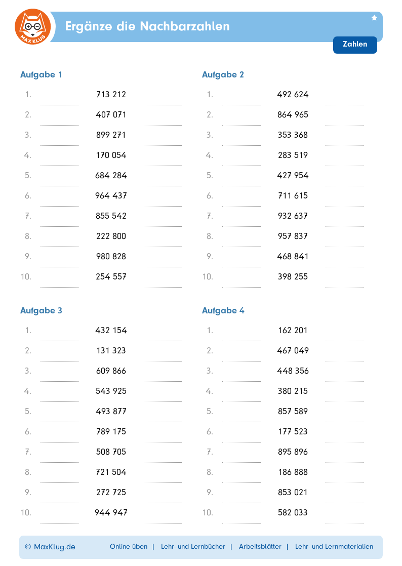 Arbeitsblatt 2: Ergänze die Nachbarzahlen (bis 1 000 000)