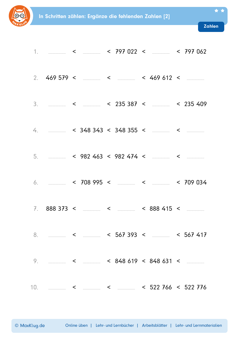 Arbeitsblatt: Vervollständige die Zahl (bis 1 000 000) [1]